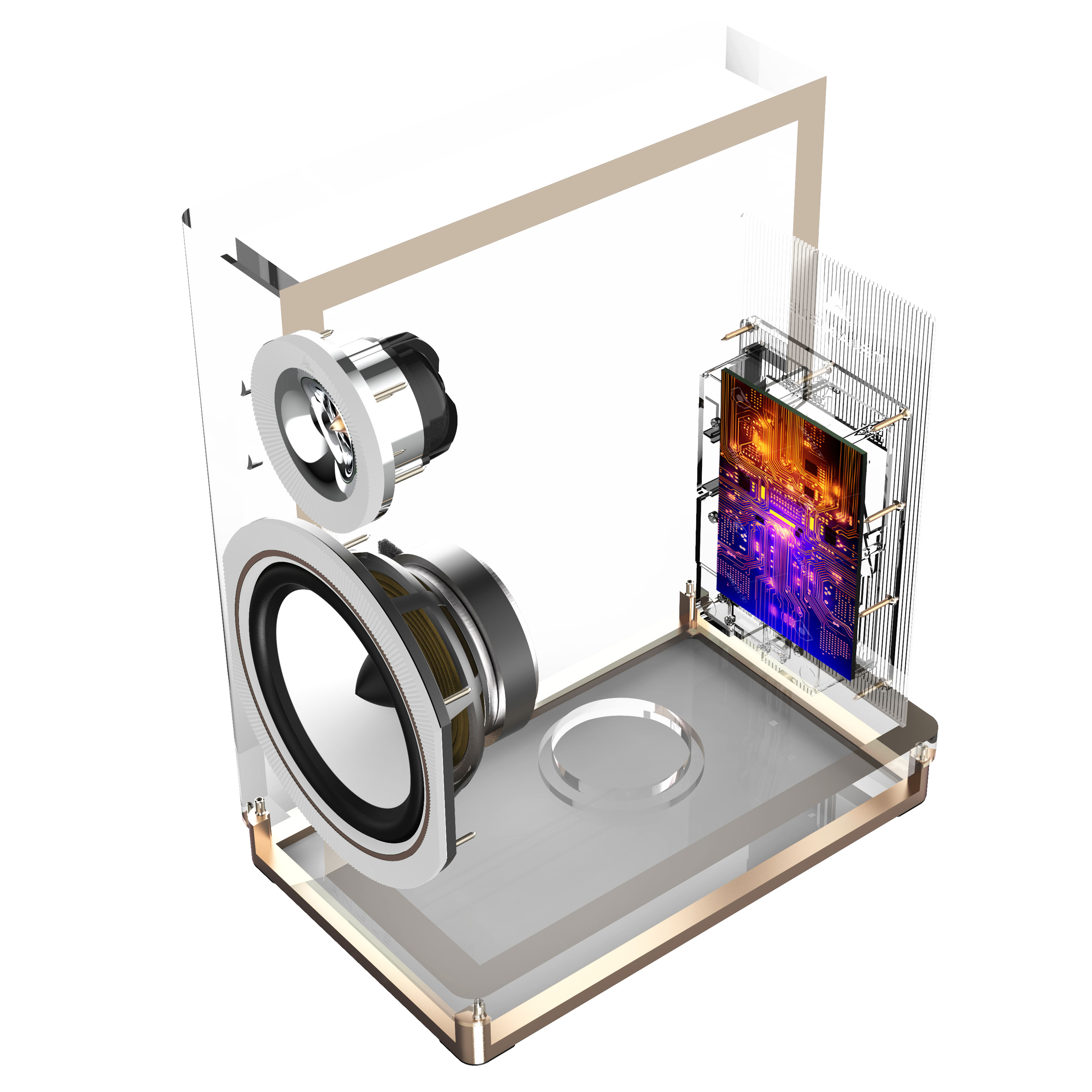 La forme incurvée de l’ébénisterie associée au relief structuré des joncs silicone assure une meilleure diffraction des ondes sonores.