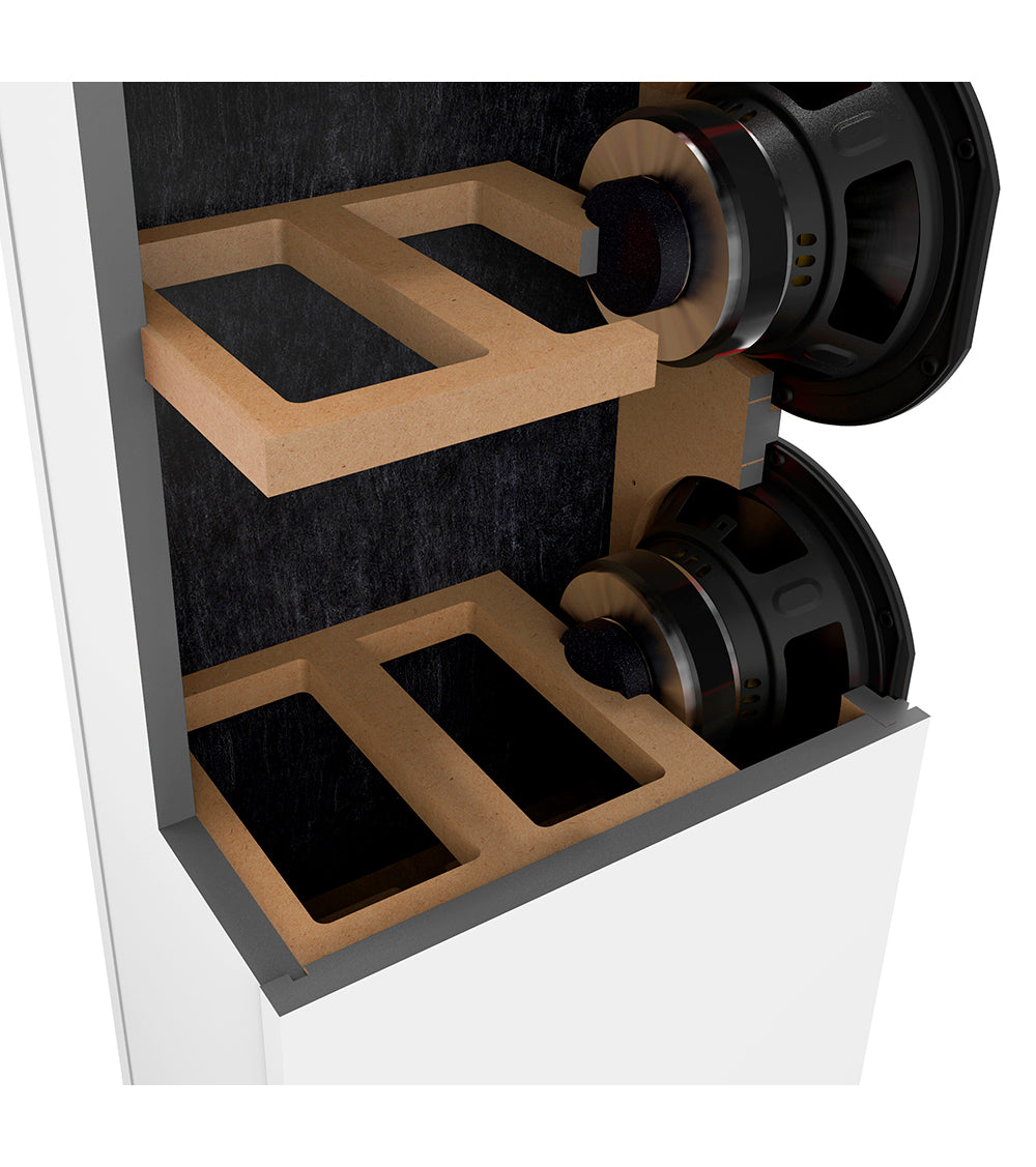 Ce principe innovant réduit le comportement vibratoire de l’enceinte et absorbe les vibrations générées par le mouvement des haut-parleurs de grave. Les vibrations générées par le débattement de la membrane sont grandement atténuées, ce dernier ne transmettant qu’une faible vibration résiduelle à l’ébénisterie.