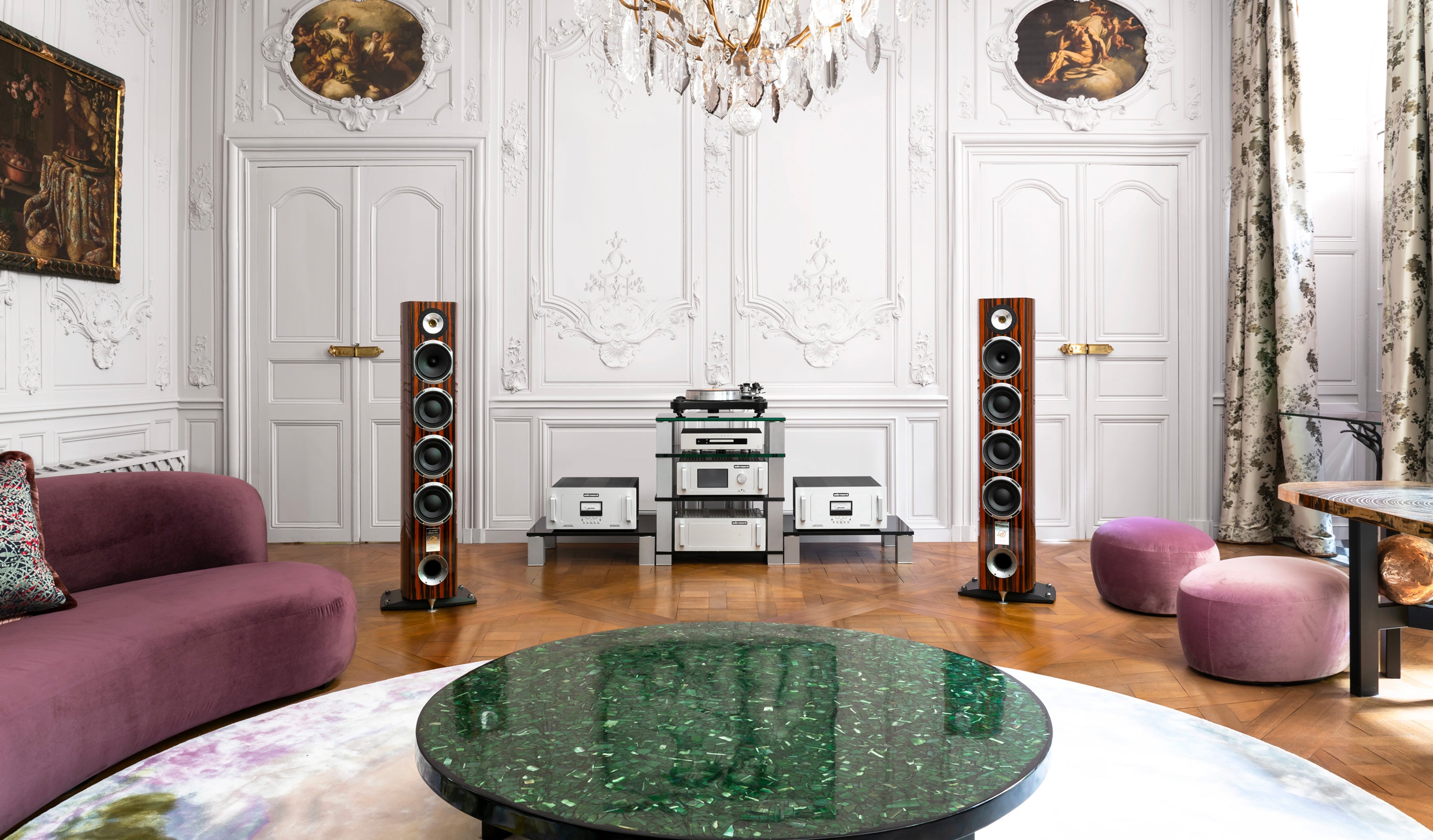 Les ébénisteries des MAGELLAN 40ème Anniversaire font l’objet d’une étude approfondie dans une quête totale d’inertie. Sa forme courbée est issue d’une superposition successive sous contrainte, de couches de 3mm de particules de bois à haute densité, excluant ainsi tout parallélisme interne.