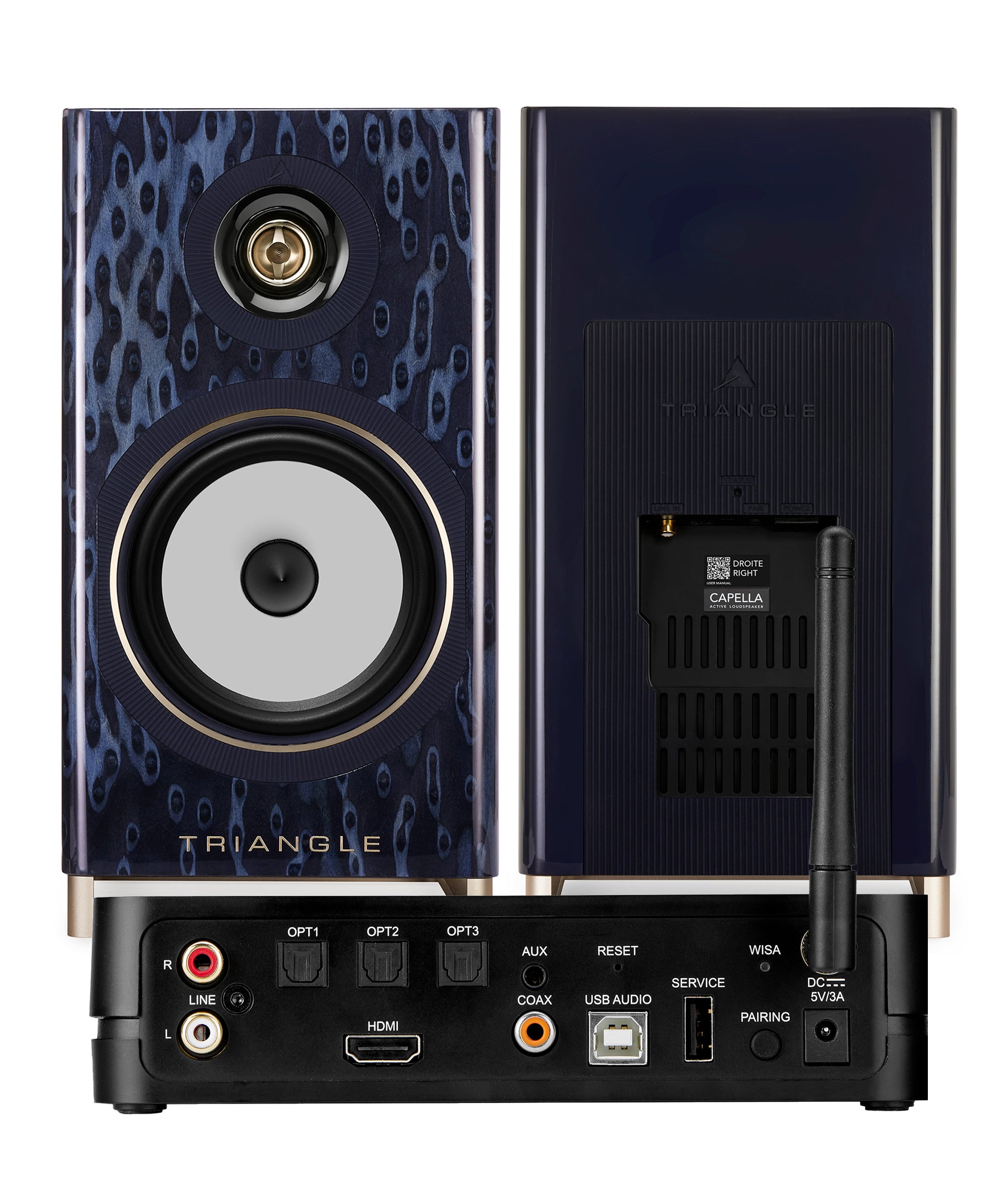 Les enceintes CAPELLA offrent des performances inouïes en associant l’expérience acoustique TRIANGLE aux nouvelles technologies. Fabriquées en France, les enceintes se parent de finitions haut de gamme avec un coffret bois vernis, ornées de pièces en aluminium. Chaque haut-parleur dispose de son propre amplificateur pour une puissance totale de 2 x 100W. Son processeur de signal numérique (DSP) permet de linéariser la réponse en fréquence de l’enceinte, tout en assurant un contrôle permanent du haut-parleur.Innovation majeure, les CAPELLA intègrent un calibrage automatique.